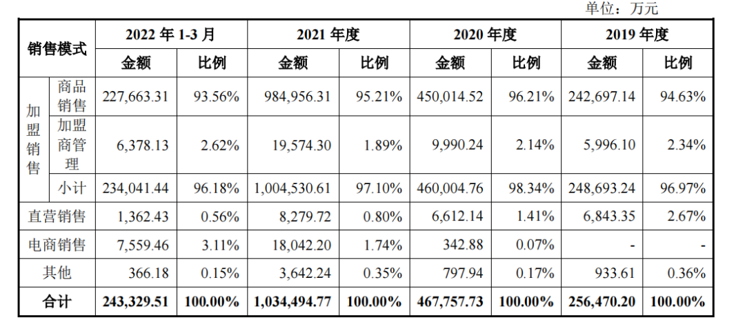 (图:蜜雪冰城招股书(主营业务收入按销售模式划分情况))