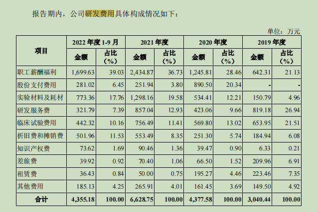 数据显示,2019年-2021年及2022年1-9月,捍宇医疗研发费用分别为3040.44万元、4377.58万元、6628.75万元和4355.18万元。据介绍,捍宇医疗研发费用主要包括股份支付费用、职工薪酬福利、实验材料及耗材、研发服务费、临床试验费用等。其中,报告期内计入研发费用的职工薪酬福利分别为642.31 万元、1245.81万元、2434.87万元和1699.63万元,占研发费用比例分别为21.13%、28.46%、36.73%和39.03%。