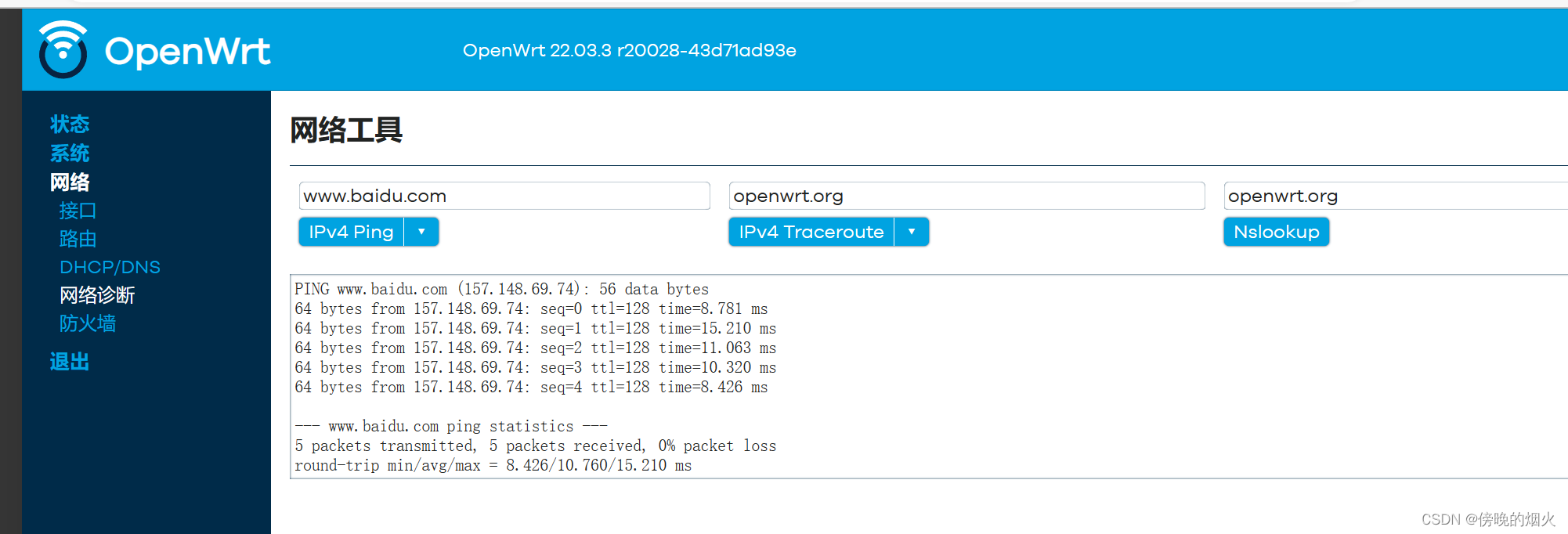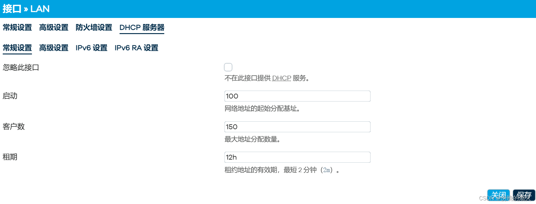 启动openwrt,通过luci进行配置,在网络-->接口中配置WAN口和LAN口,(没有WAN就 通过添加新接口创建)