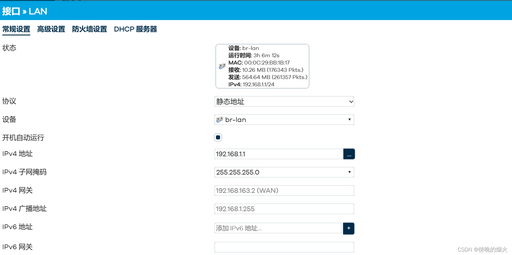 然后配置LAN口,协议是静态地址,设备选择刚才的br-lan,然后配置IP地址和掩码,网关默认是WAN,可以不填