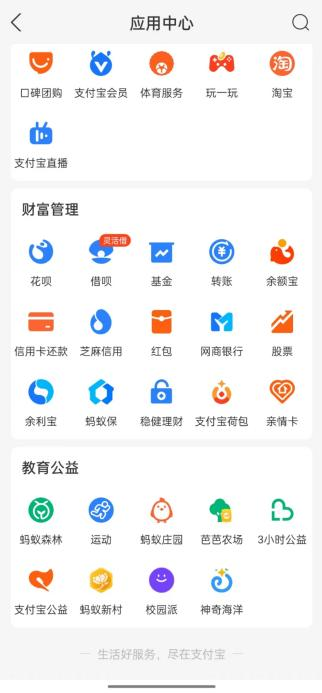 上述的“收能量、喂鸡”,主要指支付宝小程序教育公益板块的蚂蚁庄园和蚂蚁森林,水电缴费与社保公积金则指的是生活缴费与社保公积金小程序,它们被分别归类于教育公益与便民生活两个类目。如果没有刻意调整,它们毫无疑问会躺在支付宝的默认首页应用中,高德打车则取代了此前的滴滴打车,任君取用。