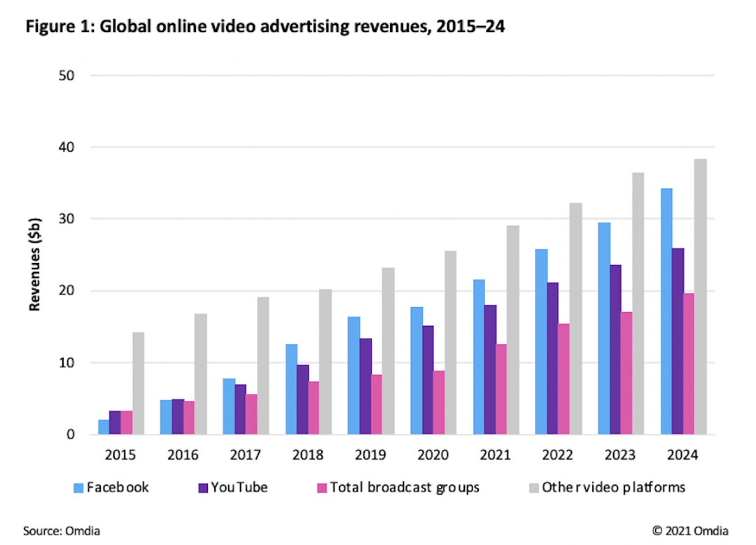目前全球在线视频广告的两大收入巨头就是 Facebook 和 YouTube,剩下所有媒体集团的视频广告收入全加一起都不如这两家中的任何一家。