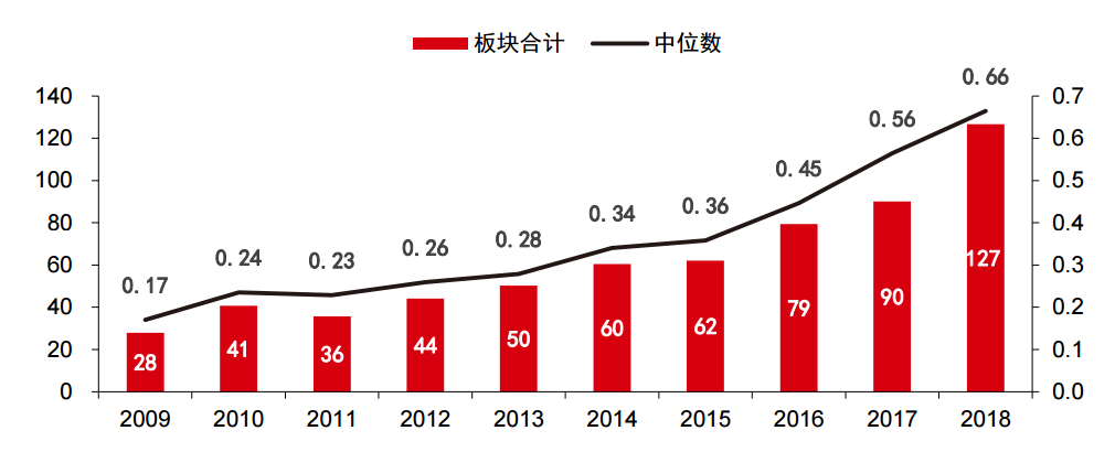 图6:2009-2018年汽车零部件板块上市公司研发费用情况(单位:亿元),资料来源:Wind,中信证券(注:研发费用板块合计口径为所有自2009年开始披露财务数据公司,中位数口径为当年所有零部件板块公司)
