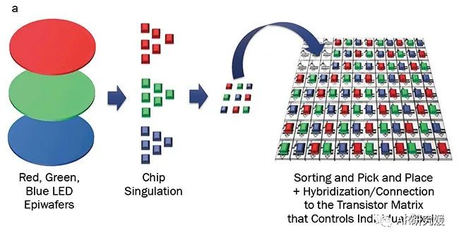 但如此小的LED,意味着首先需要LED微缩制程,然后制造「合适」背板和复杂精密的驱动电路,最后将大量的RGB LED晶体从不同的生长源基板分离,再精准转移嵌入目标背板并连接上驱动电路,所谓 pick-and-place。