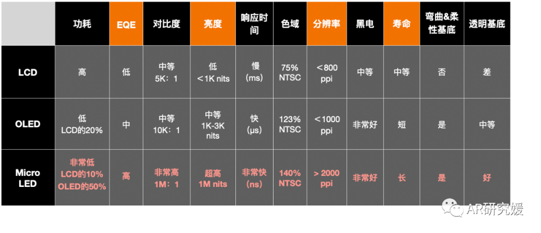 还有下一代消费电子大单品AR/VR,对于超高PPI、高亮度、高EQE光电转化、低功耗、对比度、响应时间(画面滞后)方面的要求,Micro LED能够让AR/VR的体验上升一个台阶。