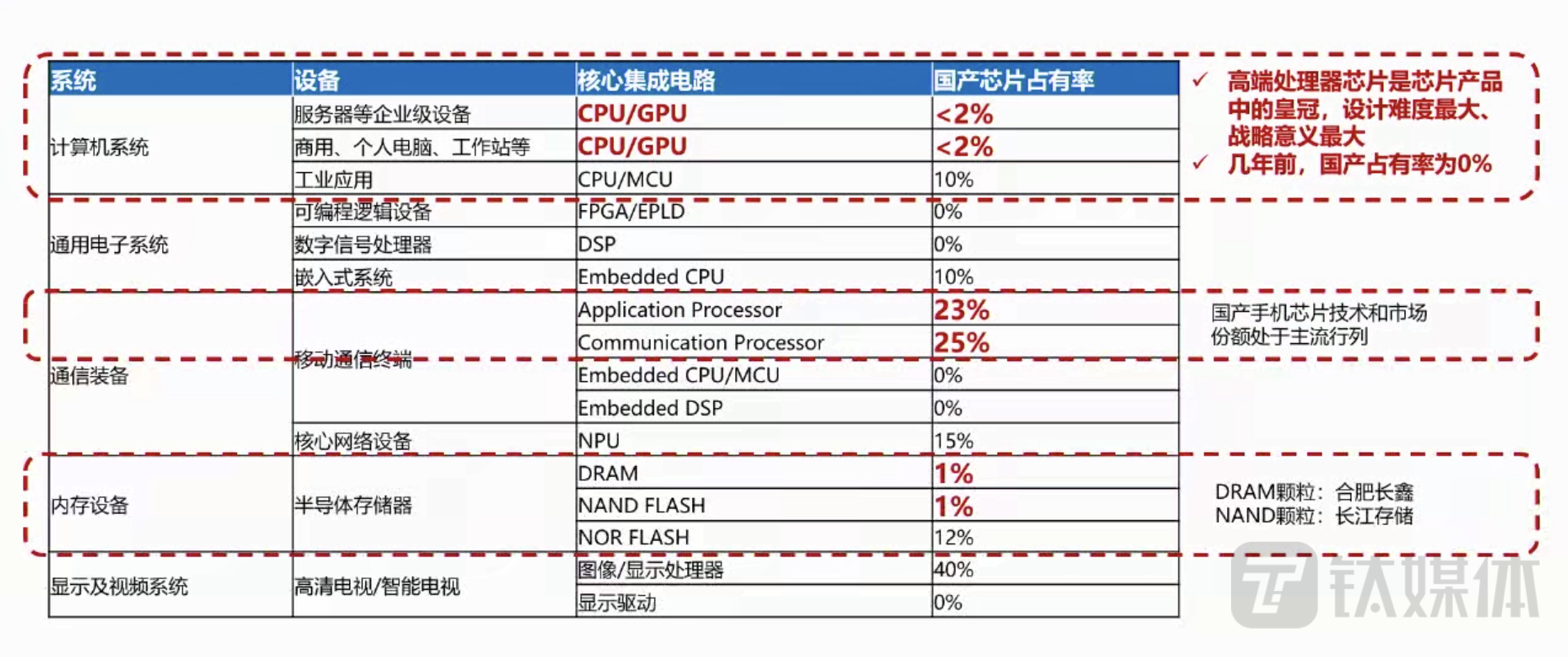 CPU公司海光产品经理史谨璠则给出另一个行业数据显示,包括高端处理器芯片、内存芯片等领域,国产占有率低于2%。