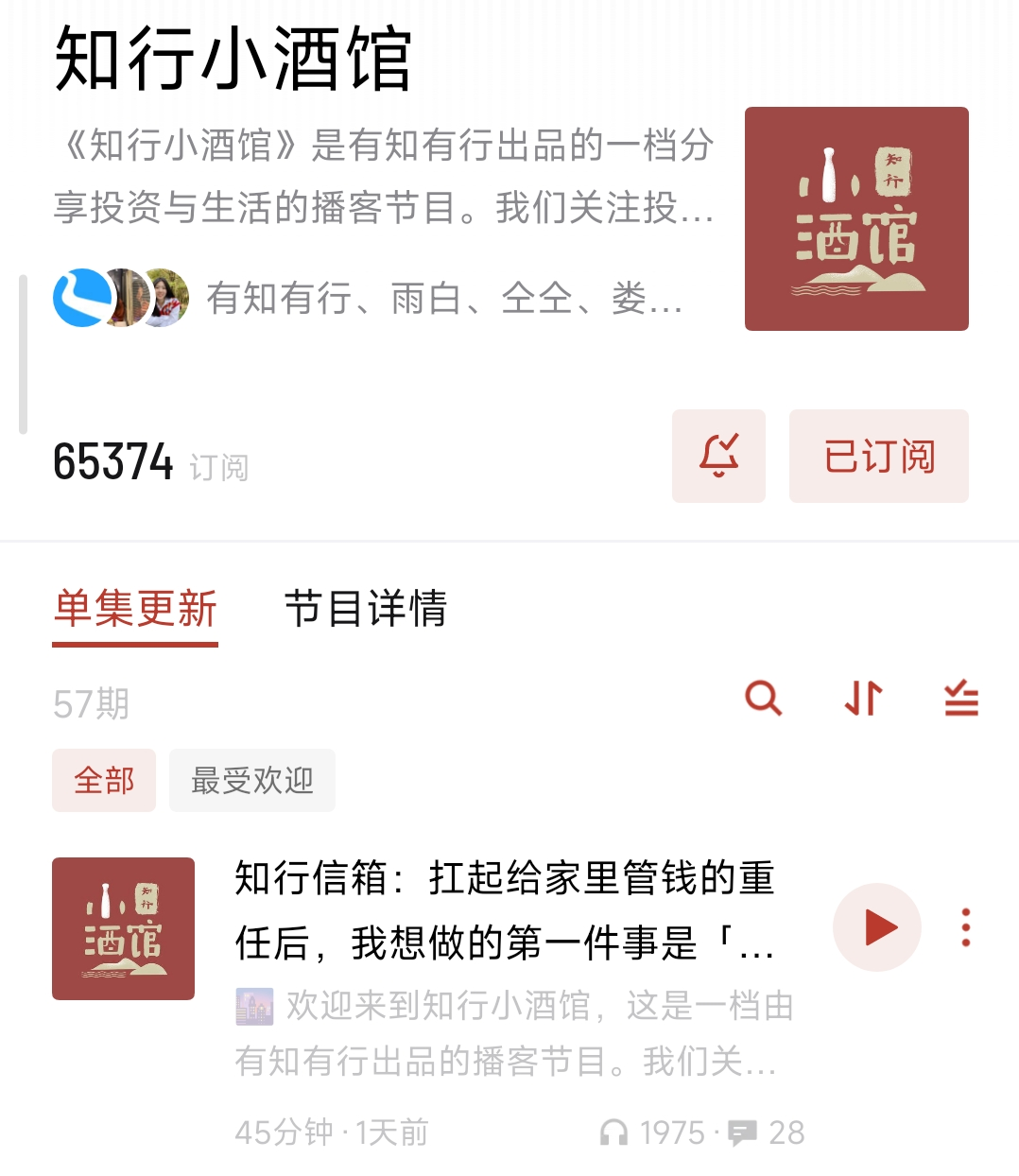 知行小酒馆是比较典型的品牌播客,其由有知有行出品,是一档分享投资理财相关知识的播客节目,目前在小宇宙上的订阅量超过65000,是小宇宙上最知名的投资类播客节目之一。有知有行做品牌播客的时间很早,早在“中文播客元年”2021年的1月就推出了第一期节目,目前为止已经推出了57期节目。