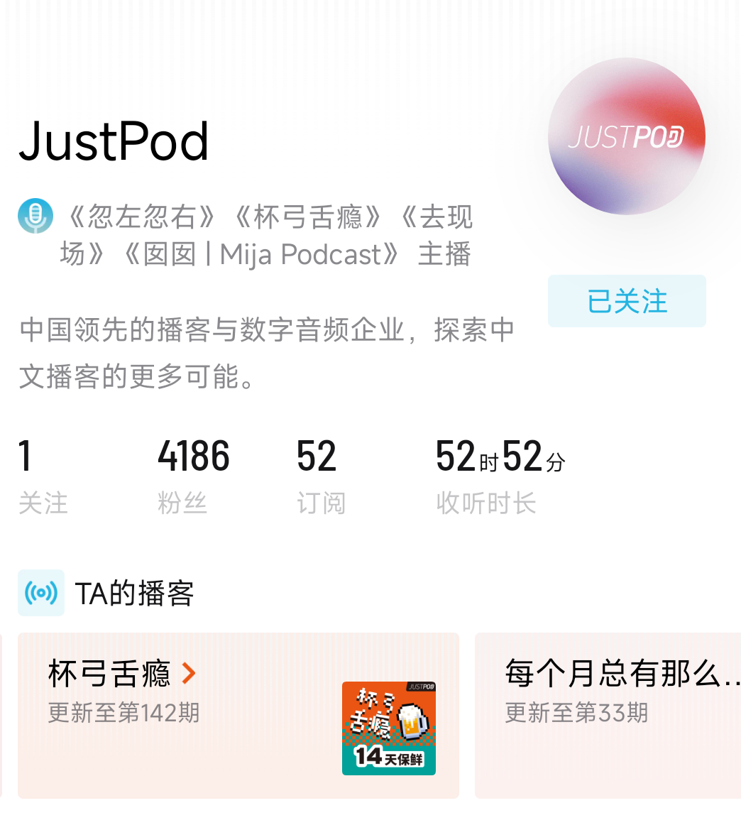JustPod是国内最早专注播客领域的企业之一。2018年,杨一和另一位创始人程衍樑在上海创办了JustPod,不同于很多先做内容后寻求商业化的播客公司,用杨一自己的话说,JustPod从一开始就是为商业化而诞生的。