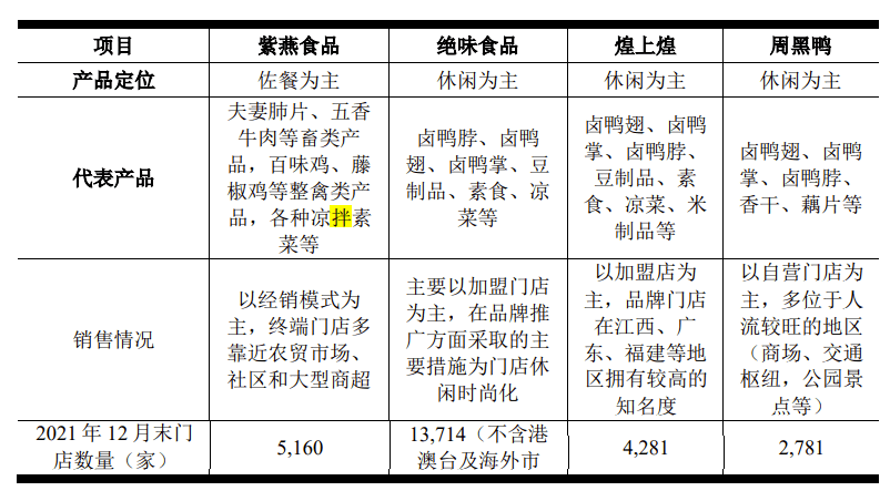在新模式之下,紫燕食品快速扩张。招股书显示,2018年到2021年底,紫燕食品的门店数量从2884家增长到5160家,增速超20%。虽距离第一位绝味食品的13000多家尚有差距,但已领先周黑鸭和煌上煌的门店数。