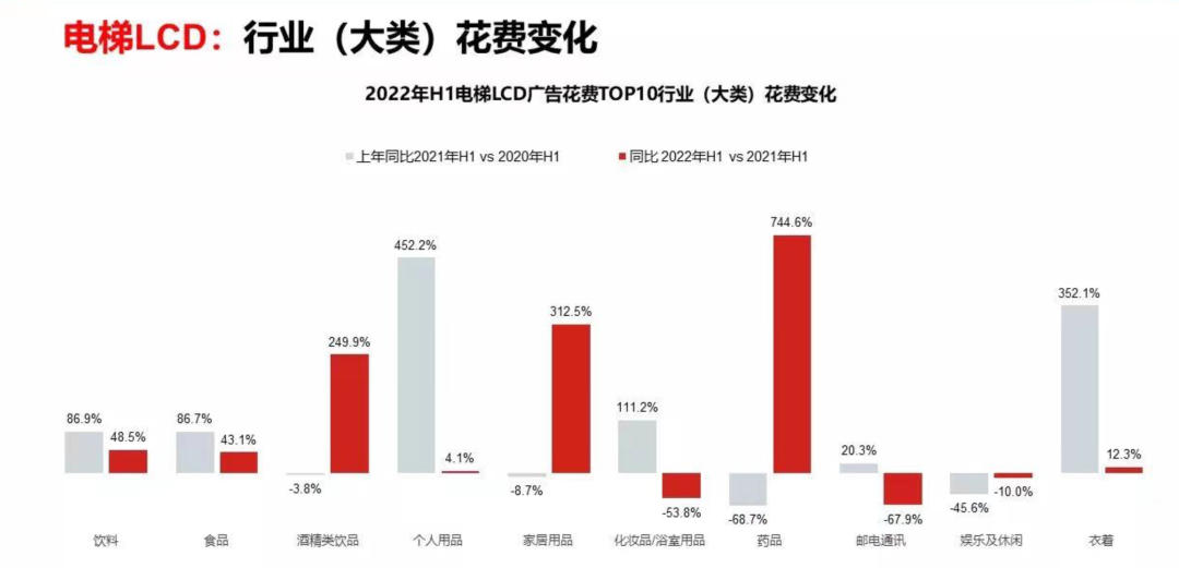 即便是在广告大盘向下的2022年上半年,也有不少行业,提升梯媒预算,其中,个人用品投放,同比增长了136.9%,而酒精、饮品、食品则同比增长了42.5%、47.5%、38.5%。