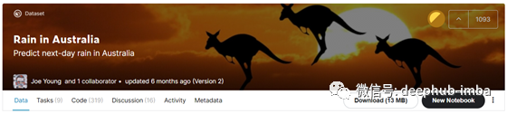 为了演示,我们将使用一个名为Rain in Australia的数据集。它描述了不同日期和地点的天气特征。这个数据集也是一个监督学习问题,我们可以使用这些数据来预测明天是否下雨。这个数据集可以在Kaggle上找到,你可以在这里访问它。