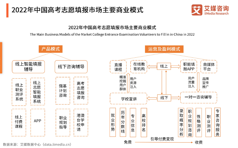 事实上,近几年高考志愿填报市场已经形成较为成熟的商业模式。艾媒咨询报告显示,2022年中国高考志愿填报市场的主要商业模式分为两种:一种是产品模式,包括线上智能填报辅导和线下咨询辅导;一种是运营及盈利模式,线上包括在线教育机构、直播课程、智能填报APP和自媒体平台,线下包括学校宣讲和一对一咨询辅导,线上线下相互融合。