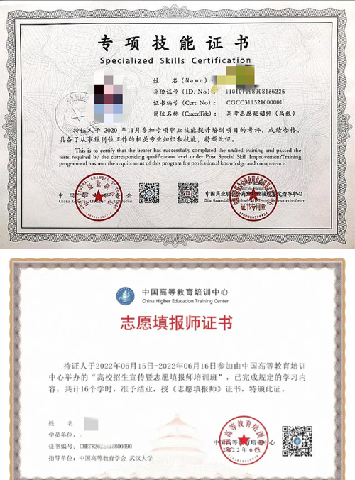 据新华社2019年报道,一些从事志愿填报辅导的机构同时开办“高考志愿规划师”培训班。为期4天的培训收费6980元,几乎零门槛招收学员,培训后发放高考志愿规划师证书。一名工作人员称,可以用400元一张的价格,买到全国职业人才认证管理中心出具的证书。