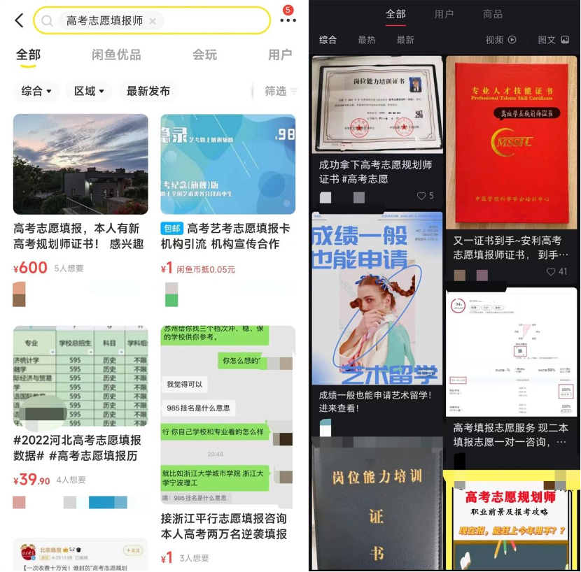 另外还有一些未公开、查询不到资历背景的。每年的6、7月,一些自称是“高考志愿填报师”的账号就会活跃在高校圈和闲鱼、小红书等平台。