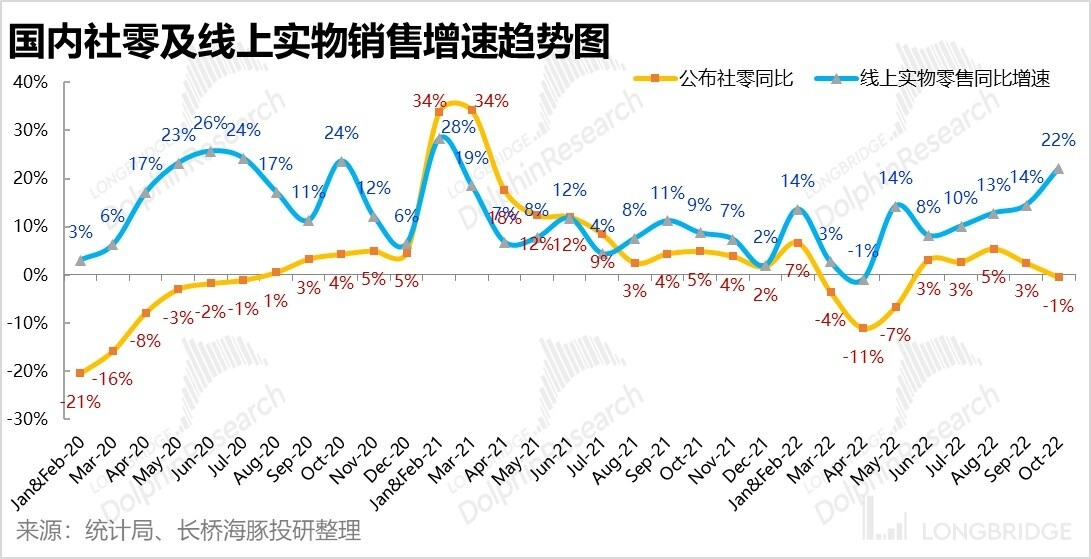 不过亮点是线上实物零售的表现却异常强劲,同比增速连续四个月份提速上升,只是原因未必值得乐观,因为核心是今年阿里双十一活动中前置了付尾款的时间,让大量的交易金额释放到了 10 月的最后一天晚上。