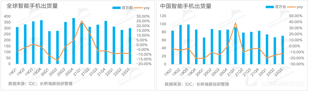 2022 年 Q3 旺季不旺,全球智能手机市场依旧承压。根据 IDC 最新数据,全球智能手机市场仍面临压力,2022 年 Q3 出货量达 3.02 亿部,同比下降 9.7%,主要系宏观经济以及消费者可支配收入不确定性,疫情封控措施,手机创新升级放缓等影响消费者购机欲望。