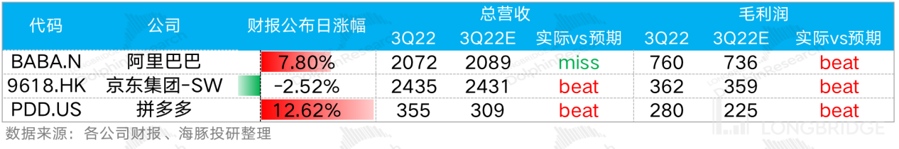 宏观经济的冲击下,电商行业的竞争依旧激烈。具体到个股来看,以阿里、京东、拼多多三家龙头公司为例,海豚君在《美股 “打回” 现实,新兴市场还能蹦跶多久?》里有做过总结:**电商板块可以集体性地看到竞争的回落,从原来的卷 “市占” 快速进入到 “收入比烂、利润卷起” 的阶段。——**双十一基本盖棺定论,阿里、京东对于四季度都给出了及其悲观的指引,虽然在海豚君看来,电商公司想要做利润释放并不难,但实际情况是,大多数公司降本之后,利润虽然释放,但收入却并没有做出来。