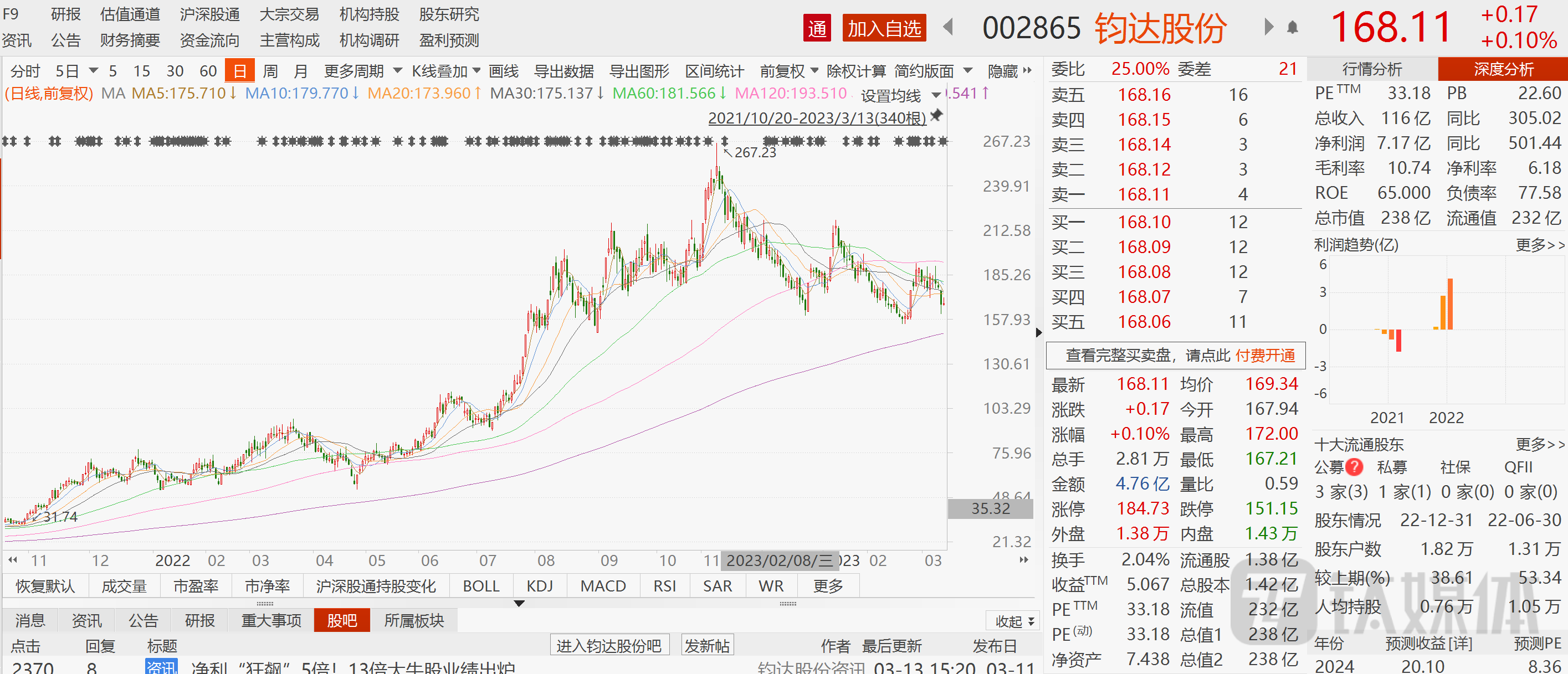 虽然钧达股份扭亏为盈,但是观察其二级市场股价却较去年高点跌去37%。截至3月13日,钧达股份报168.11元,最新市值238亿元。