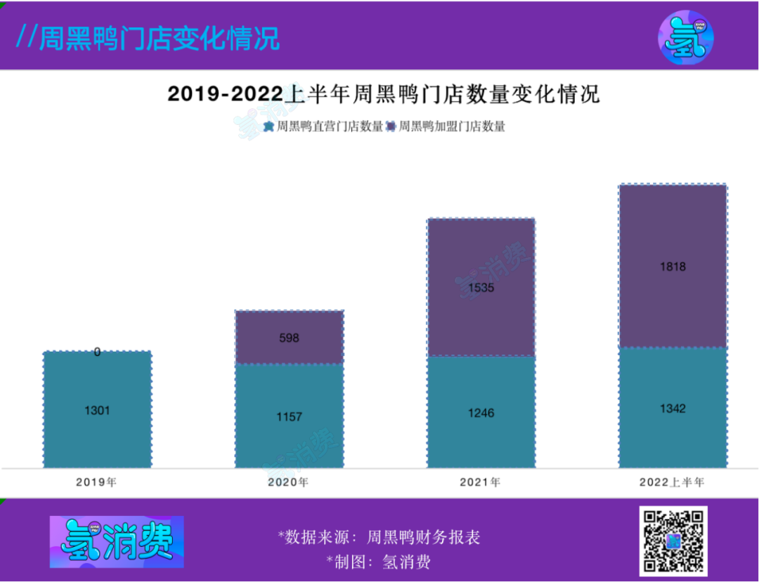 2019年,周黑鸭门店数量仅有1301家,远低于绝味的10954家和煌上煌的3706家,采用双模式混合经营后,发展至2022年上半年,周黑鸭门店数量已经扩增超过3000家。