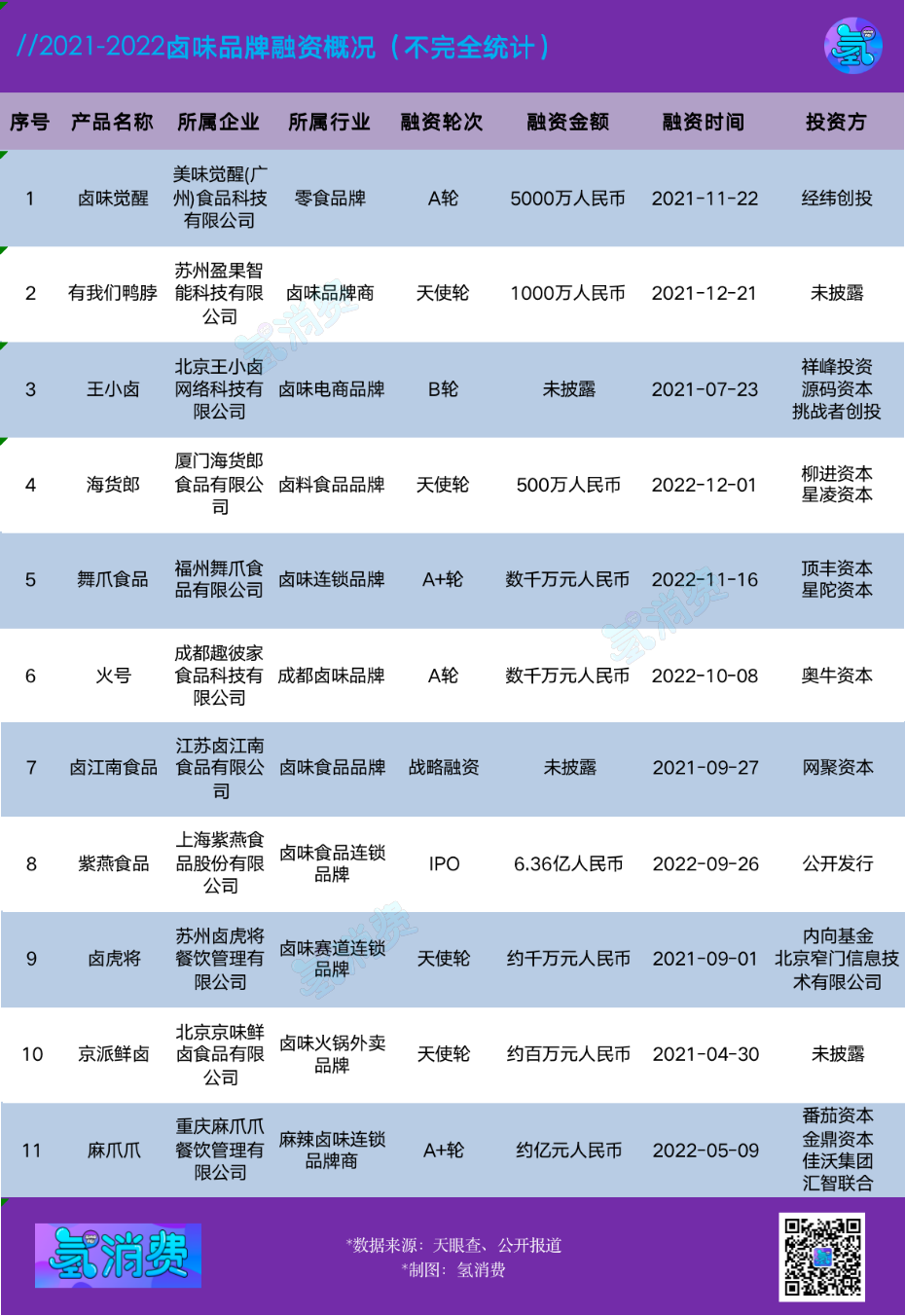 据不完全统计,2021年以来,包括王小卤、麻爪爪、盛香亭、热卤食光、馋匪、卤大妈等不下10个卤味新消费品牌,接连在资本市场上获得融资助力,其中更是包括红杉资本、腾讯投资、今日资本等国内外知名投资机构都纷纷涌进卤味赛道。