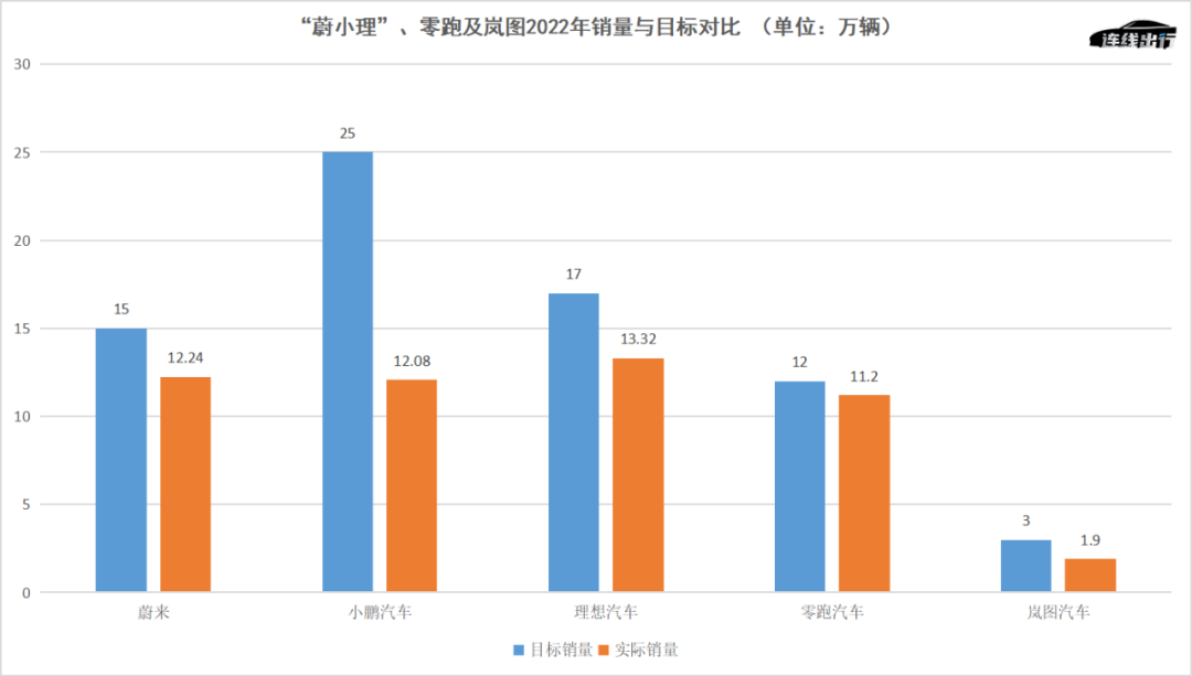 “蔚小理”、零跑及岚图2022年销量与目标对比,数据来源于公开数据,连线出行制图