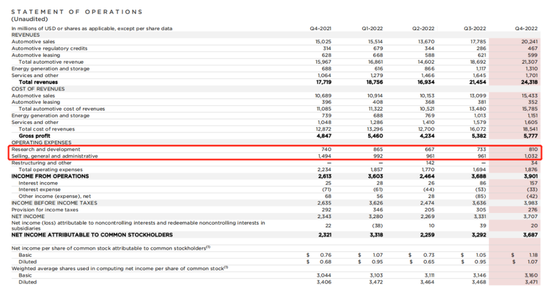 特斯拉2022年研发与营销费用明细,截图自财报