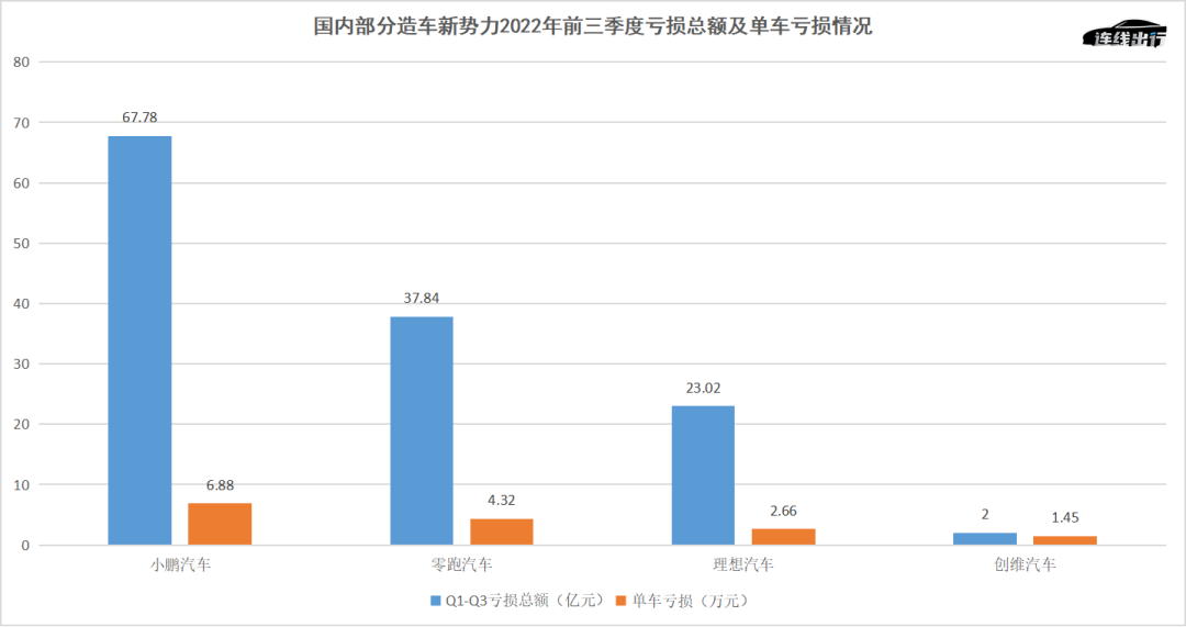 国内部分造车新势力2022年前三季度亏损总额及单车亏损情况,数据来源于公开数据,连线出行制图