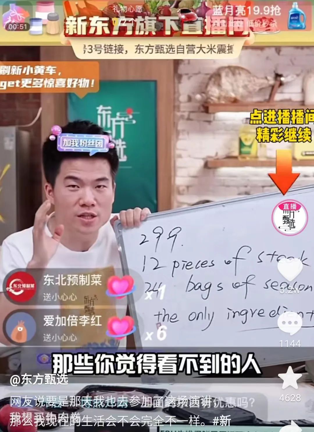在这个「一切皆可段子化」的时代,这显然切中了流量的爆点。6月10日晚,主播是8年间教过50万学生的英语老师董宇辉,他会在满足用户让他讲英语的同时提醒,「please remember to buy something, ok?」然后认真地搬出小黑板,教大家「牛排原切」的正确说法是「Original Cutting」。