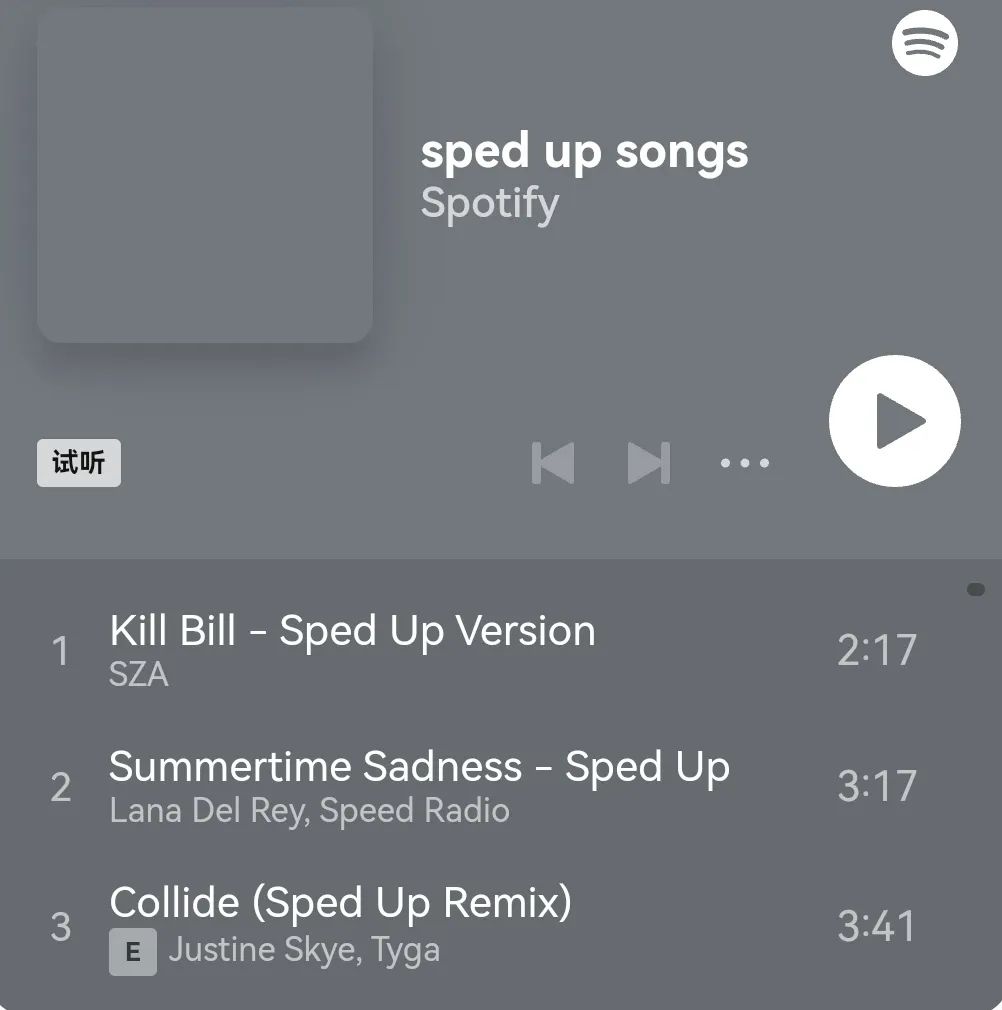 值得注意的是,变速音乐看上去仍是一个十分模糊的音乐业务,它或许会出现人为介入流媒体的干预,进而影响受众收听选择。比如在Spotify上,便出现了一个收集加速歌曲的歌单,但列表内却只有华纳音乐旗下的歌曲,其每月有着超过1200万听众收听,日均则超过200万收听。
