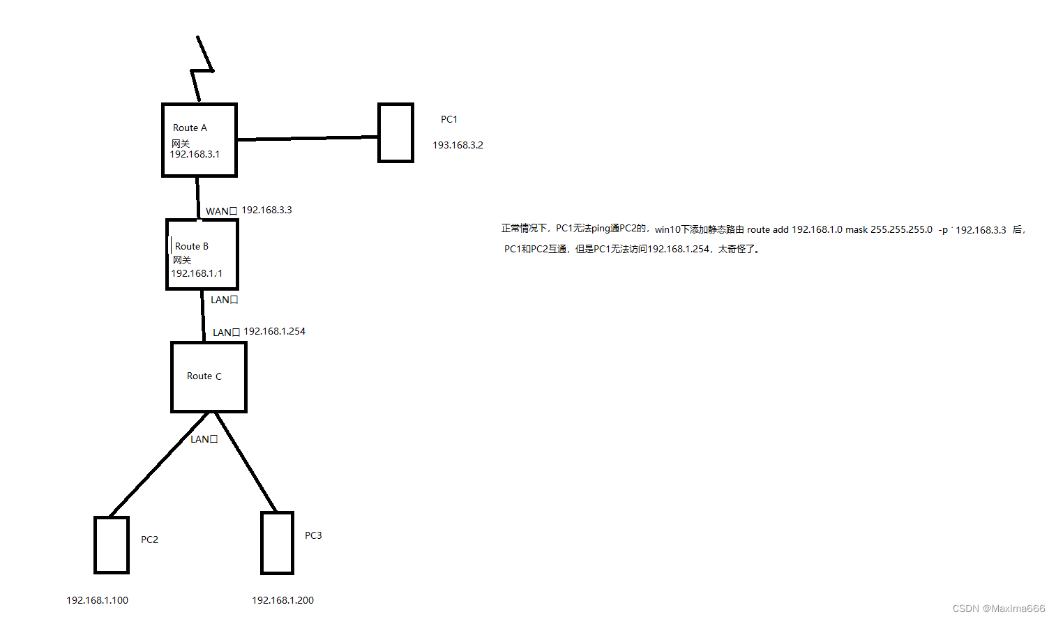 图片上描述的网络环境,PC1死活无法访问routeC的管理界面192.168.1.254,所有192.168.1.X的机器都可以访问192.168.1.254。