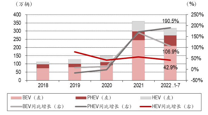 受益于比亚迪宋PLUS、秦PLUS等优质混动车型供给的增加,消费者选购混动车的热情甚至盖过纯电动。过去的2022年,插电式混动汽车销量同比增速达到150%,远超纯电动增速的82%。