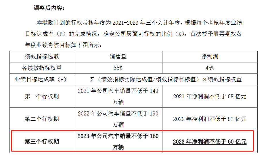 赶在2023年之前,长城汽车主动下调了今年的业绩目标。根据长城汽车发布《关于调整2021年限制性股票激励计划及2021年股票期权激励计划业绩考核目标》公告,将2023年的绩效指标由销量不低于280万辆、净利润不低于115亿元,下调为销量不低于160万辆、净利润不低于60亿元。