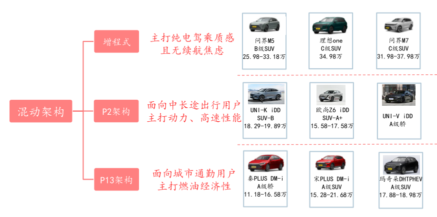混动技术按模式来分,一般包括油电混动( HEV )、插电混合( PHEV )以及增程式混动( REEV )三大类。
