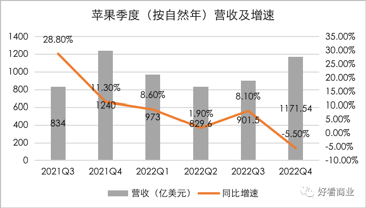 2023财年第一财季(自然年2022.Q4),苹果实现营收1171.54亿美元,同比下滑5.5%,低于市场预期。这个下滑幅度是2019年以来首次同比下滑,也是2016年以来最大季度跌幅。