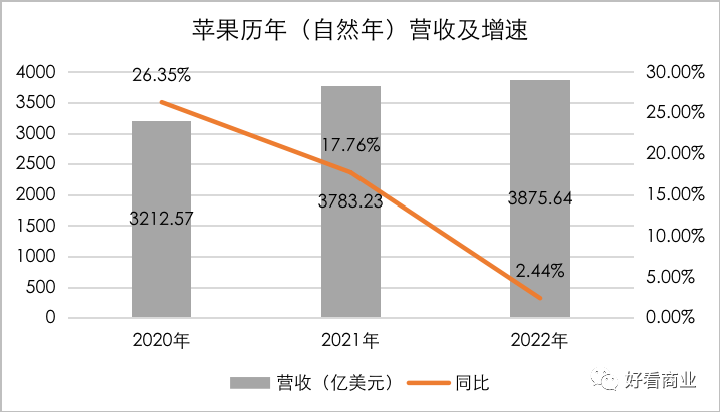 先来看苹果。统观整个2022(自然年),苹果的业绩都差强人意——实现总营收3875.64亿美元,同比仅增长2.44%;而2020、2021年的营收增速分别为26.35%和17.76%。