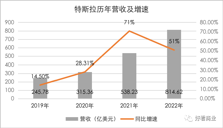 在收入层面,2022年,特斯拉实现营收814.62亿美元,同比增长51%;2021年的同比增速是71%。