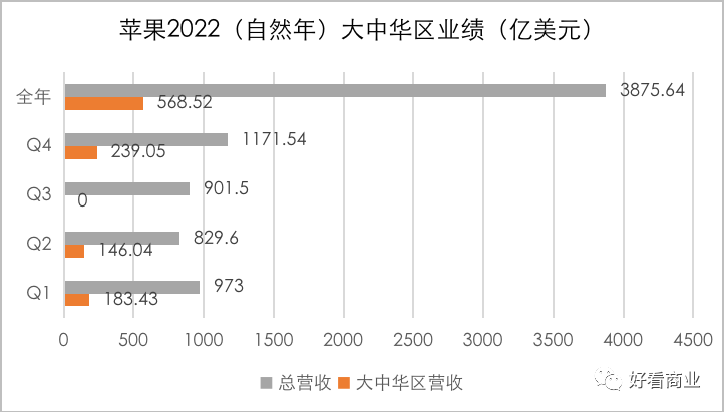 过去很多年里,中国市场是苹果业绩的一大增长引擎。2022年,苹果在大中华区共实现营收568.52亿美元,在其3875.64亿美元的总营收中占比14.7%;2021年的占比是19.25%。相比2021年,苹果在大中华区的营收规模同比下滑了21.95%。