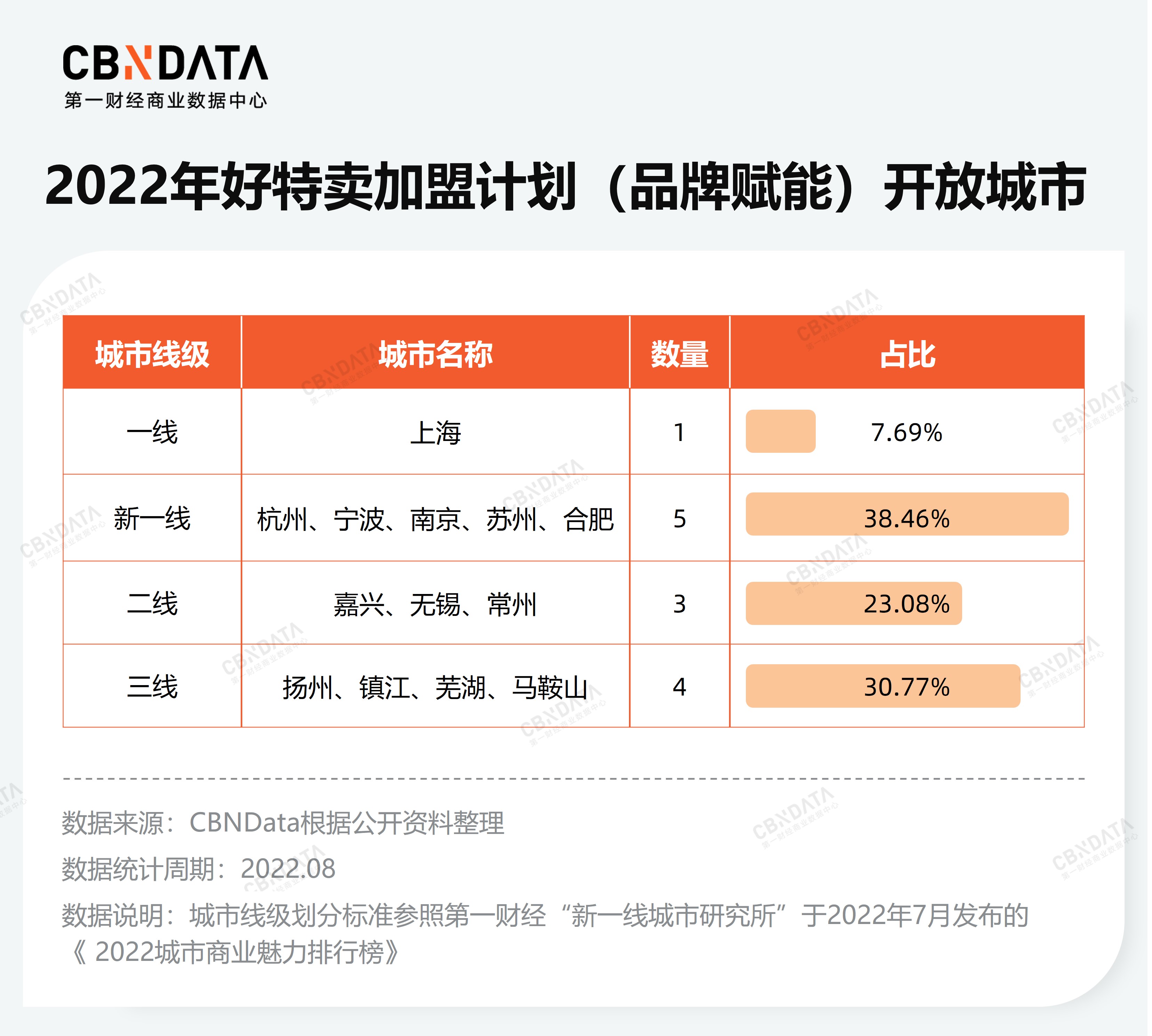 一线城市的激烈竞争之下,不少玩家已经在往下沉市场渗透。根据好特卖的加盟计划,沿用“好特卖”品牌的加盟模式所开放的城市中,二线、三线城市占比超一半,还包括镇江、芜湖、马鞍山等三线城市。叠加其“未来三年开出5000家店”的计划来看,下沉市场显然是其未来布局的重要一环。