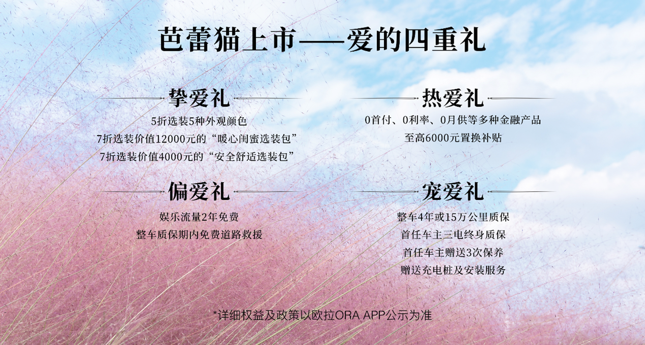 新车上市欧拉还送出好礼包含“挚爱礼”、 “热爱礼”、 “宠爱礼”和 “偏爱礼”的“爱的四重礼”。具体包括,5折选装5种外观颜色、7折选装价值12000元的“暖心闺蜜选装包” 、7折选装价值4000元的“安全舒适选装包”、0首付、0利率、0月供等多种金融产品、至高6000元置换补贴、整车4年或15万公里质保、首任车主三电终身质保、首任车主赠送3次保养、赠送充电桩及安装服务。同时,娱乐流量2年免费,以及整车质保期内免费道路救援。