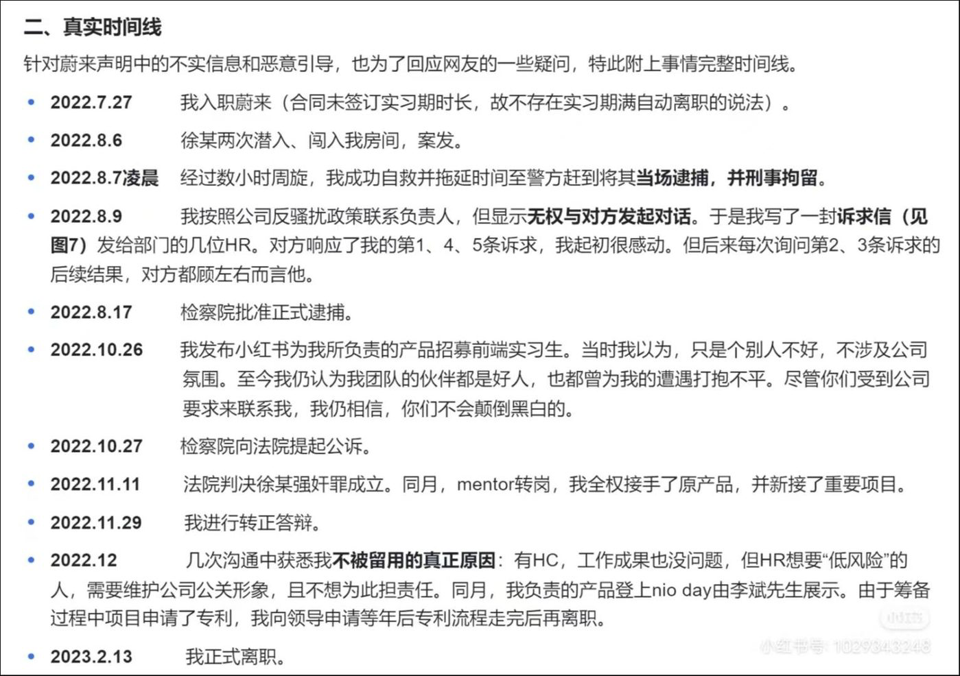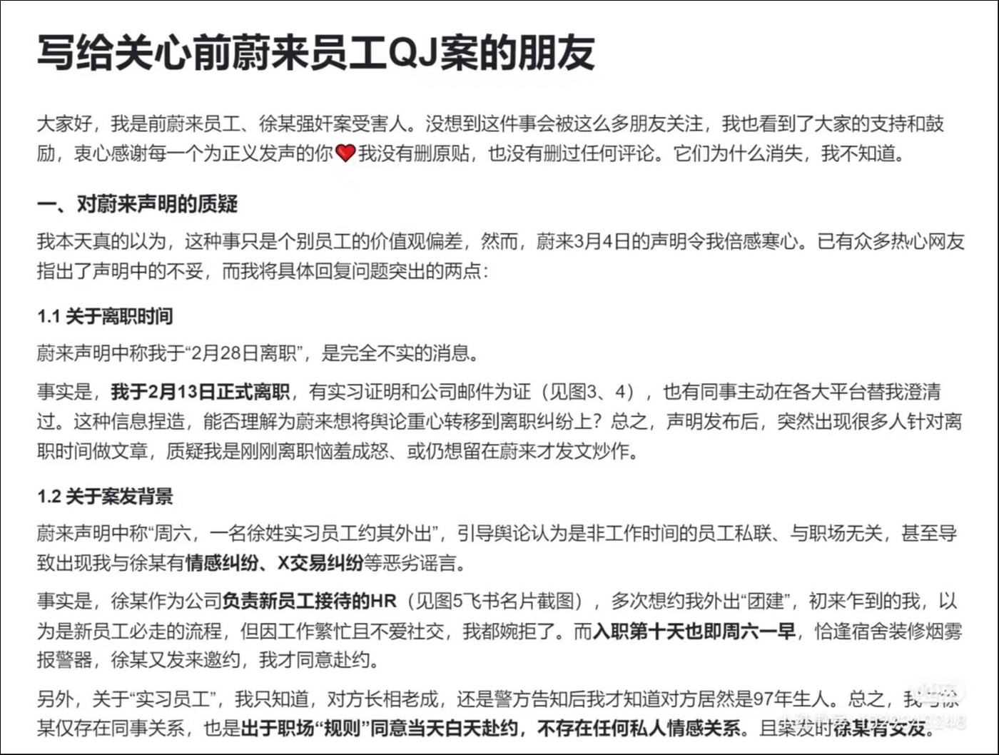 3月6日,当事人再次发帖《致关心前[蔚来](https://www.tmtpost.com/kegu/view/price?code=hk09866)员工QJ案的朋友》做出回应,并配文称由于原帖被删,且无法发出新笔记,所以又新开了号,对事件始末进行了补充,并提供了相应证据及素材截图,针对[[[蔚来](https://www.tmtpost.com/kegu/view/price?code=hk09866)](https://www.tmtpost.com/kegu/view/price?code=usNIO.N)](https://www.tmtpost.com/kegu/view/price?code=hk09866)3.4声明的质疑、事件的真实时间线、对[[[蔚来](https://www.tmtpost.com/kegu/view/price?code=hk09866)](https://www.tmtpost.com/kegu/view/price?code=usNIO.N)](https://www.tmtpost.com/kegu/view/price?code=hk09866)的诉求、对部分网友质疑的Q&A等等问题作出回应。