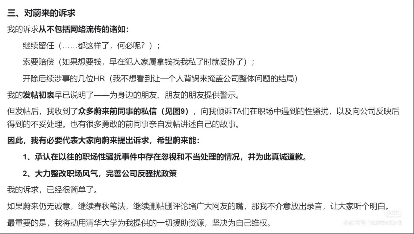该当事人表示,其诉求从不包括网络流传的诸如继续留任、索要赔偿等,最终的诉求是希望[蔚来](https://www.tmtpost.com/kegu/view/price?code=hk09866)承认以往职场性骚扰事件中存在疏忽和不正当处理的情况,并为此真诚道歉。同时,也希望[[[蔚来](https://www.tmtpost.com/kegu/view/price?code=hk09866)](https://www.tmtpost.com/kegu/view/price?code=usNIO.N)](https://www.tmtpost.com/kegu/view/price?code=hk09866)可以大力整改内部职场风气,完善公司反骚扰政策。
