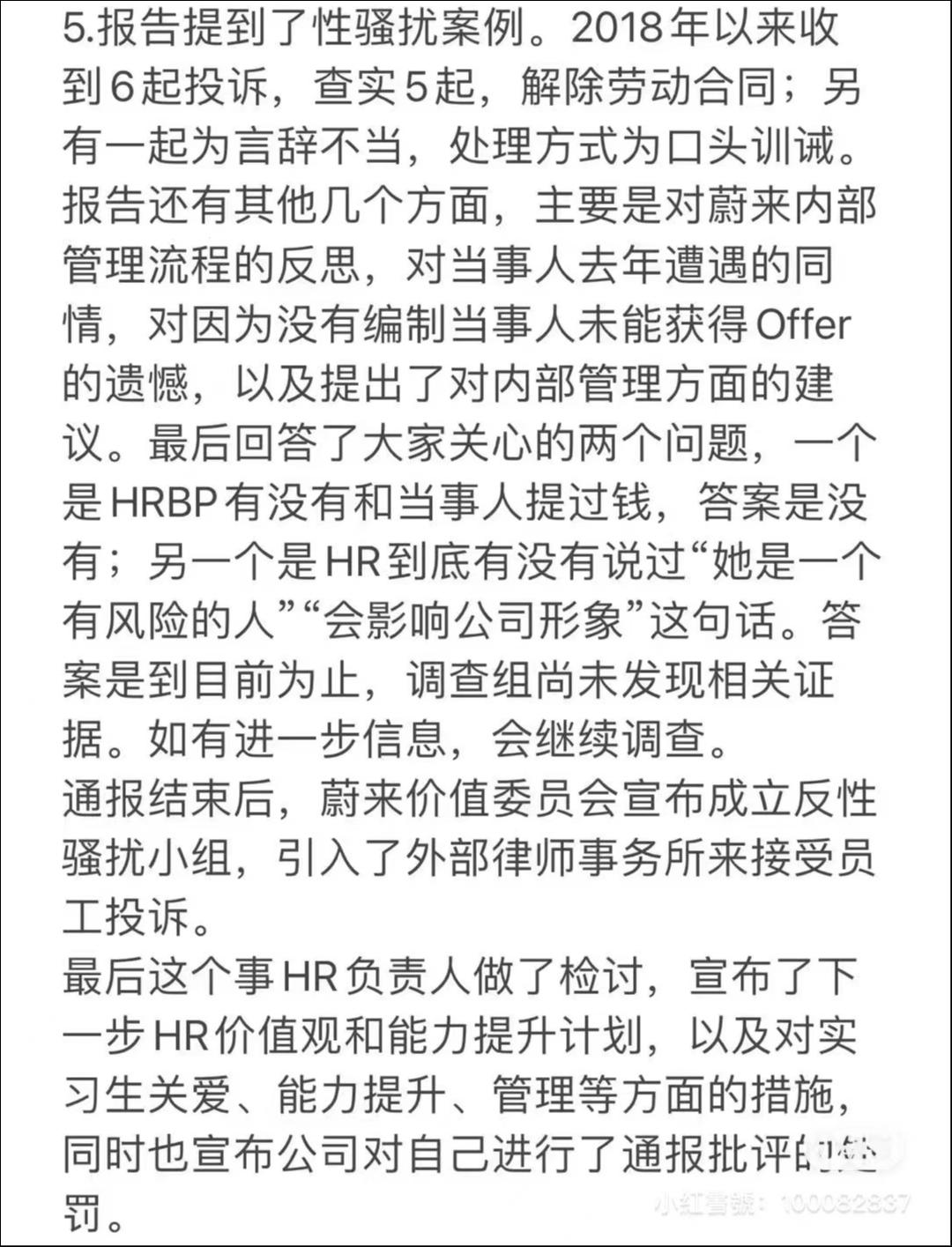 5、关于HR是否说过“她是一个有风险的人”、“会影响公司形象”等言论,蔚来回应是到目前为止,调查组尚未发现相关证据。如有进一步信息,会继续调查。