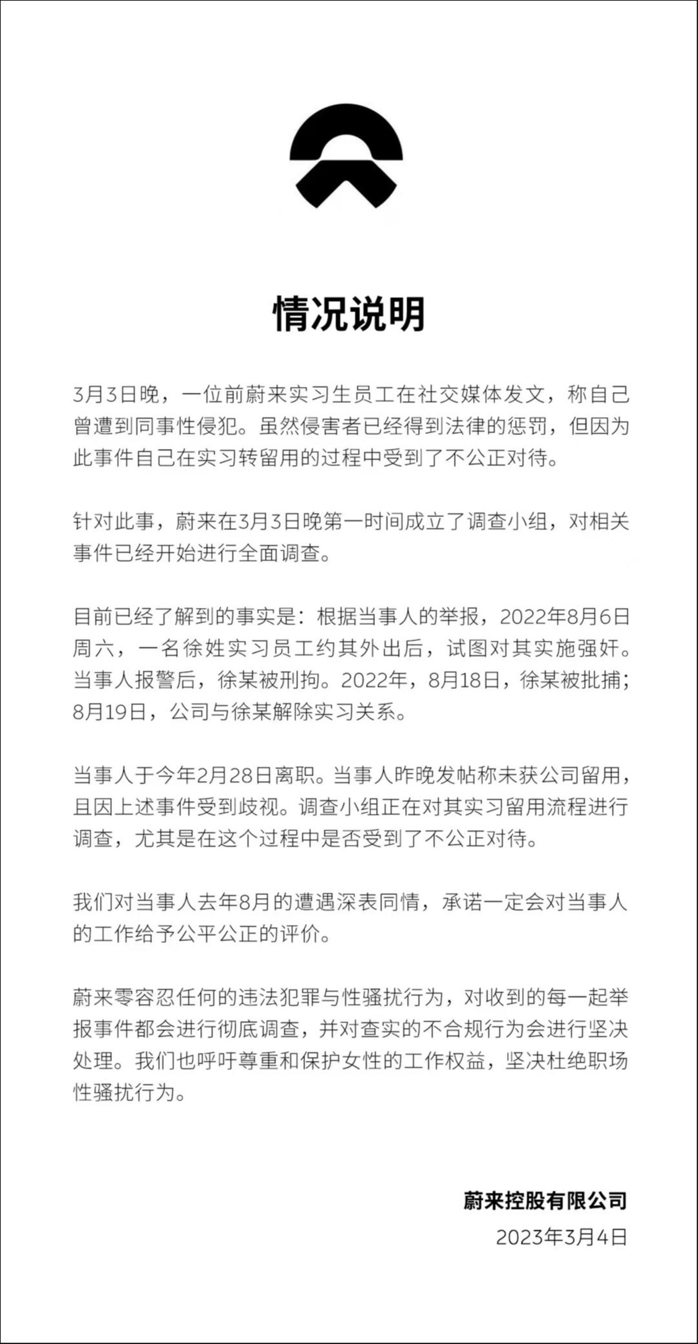 3 月 3 日晚,一位前[蔚来](https://www.tmtpost.com/kegu/view/price?code=hk09866)实习生员工在社交媒体发文,称自己曾遭到同事性侵犯。虽然侵害者已经得到法律的惩罚,但因为此事件自己在实习转留用的过程中受到了不公正对待。针对此事,[[[蔚来](https://www.tmtpost.com/kegu/view/price?code=hk09866)](https://www.tmtpost.com/kegu/view/price?code=usNIO.N)](https://www.tmtpost.com/kegu/view/price?code=hk09866)在3月3日晚第一时间成立了调查小组,对相关事件已经开始进行全面调查。