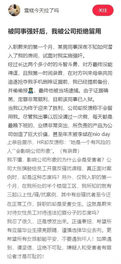 事件当事人称,其本人是清华高材生,在[蔚来](https://www.tmtpost.com/kegu/view/price?code=hk09866)自动驾驶研发岗位,其负责的产品还被李斌推荐在NIO Day展示。而且在入职[蔚来](https://www.tmtpost.com/kegu/view/price?code=hk09866)后,工作也非常勤恳,“没请过一天假”、“每天下班最晚”。但事件处理结果确实在遭遇性侵犯之后,HR 却反馈称“她是一个有风险的人”,“会影响公司形象”。