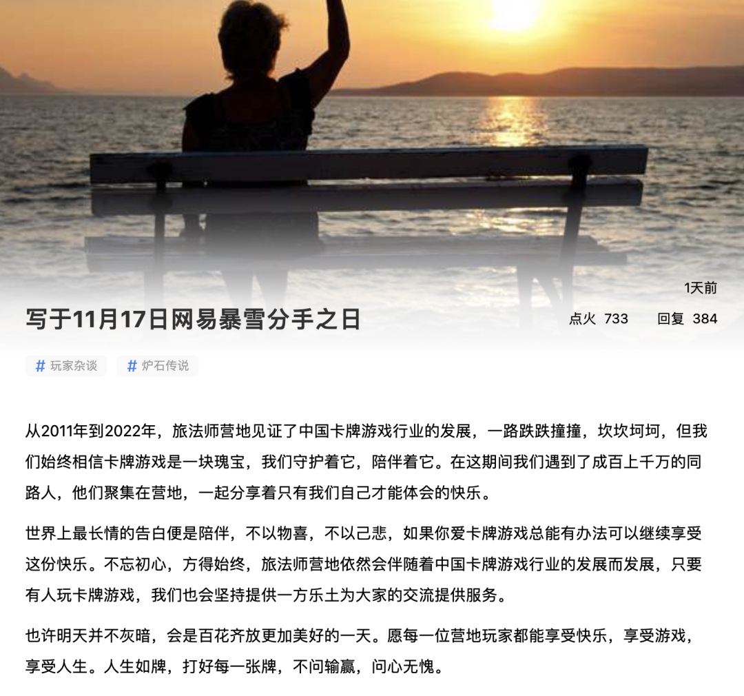 44、旅法师营地的站内官方账号发布了一篇短短的公告,标题是《写于11月17日网易暴雪分手之日》。