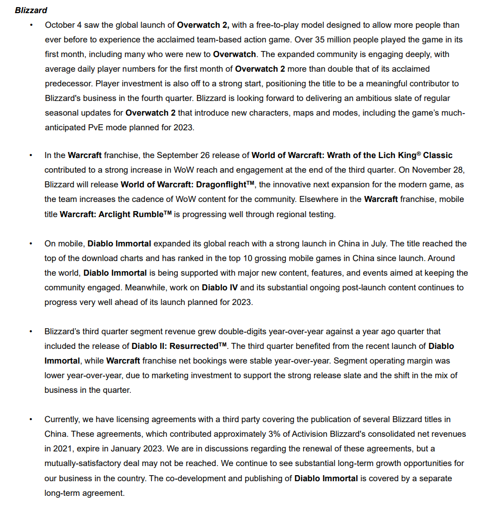与以往不同的是,本次财报中特别提到:“目前,我们与第三方签订了许可协议,内容涵盖在中国大陆发布多款暴雪游戏。这些协议约占动视暴雪2021年合并净收入的3%,并将于2023年1月到期。我们正在讨论续签这些协议,但可能无法达成双方都满意的交易。”
