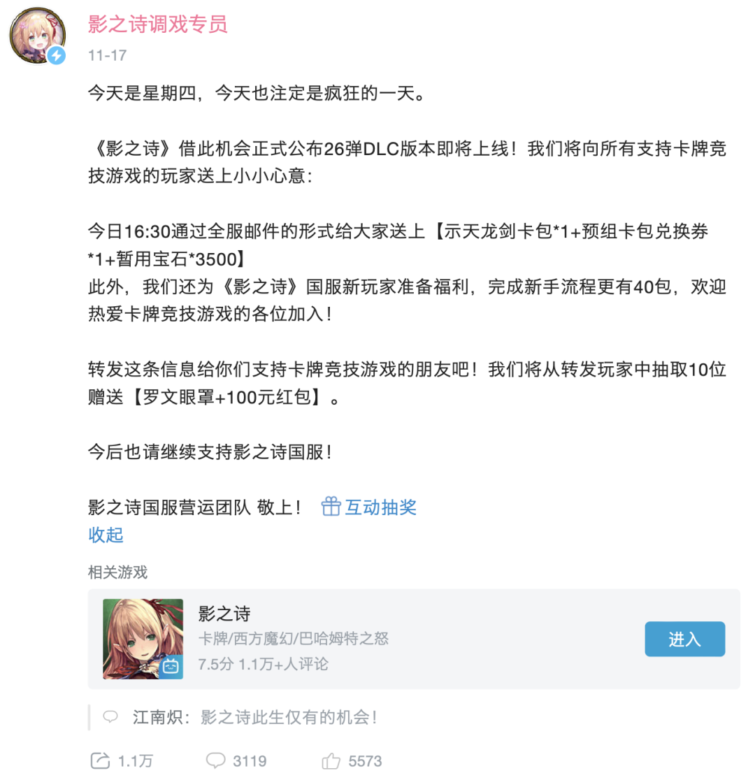 11月17日当天,《影之诗》、《游戏王:决斗链接》以及《阴阳师:百闻牌》不约而同加大了推广力度,包括“新玩家福利”“全服邮件”“666天纪念活动”等。