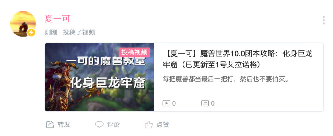 在视频简介中,夏一可留言道:**“每把魔兽都当最后一把打,然后就,也不要怕灭。”**