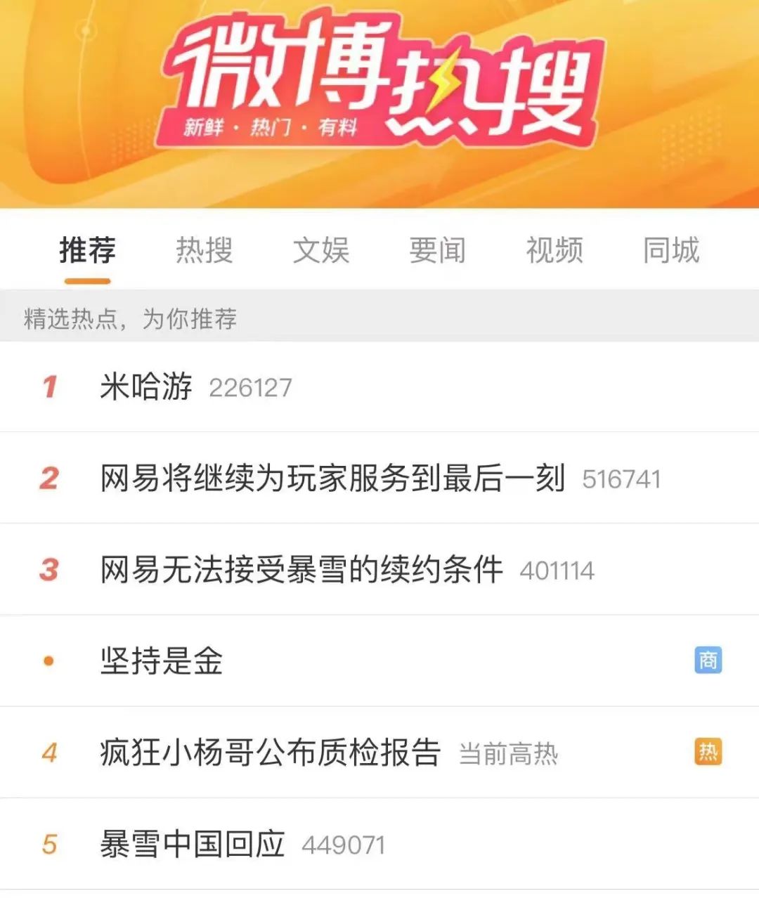 22、微博热搜前五名中,一度有三席都与这次解约直接相关,它们分别是:“网易将继续为玩家服务到最后一刻”“网易无法接受暴雪的续约条件”“暴雪中国回应”。