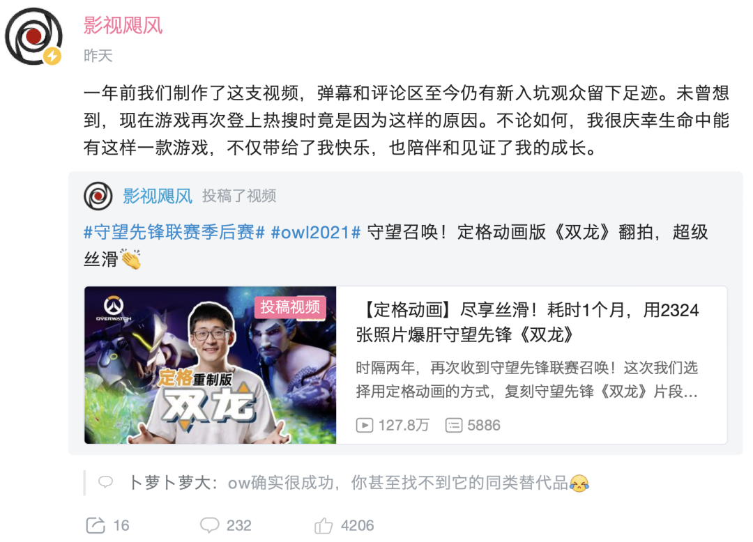 49、拥有500万粉丝的B站UP主“影视飓风”转发了一年前制作的《守望先锋》主题定格动画视频。